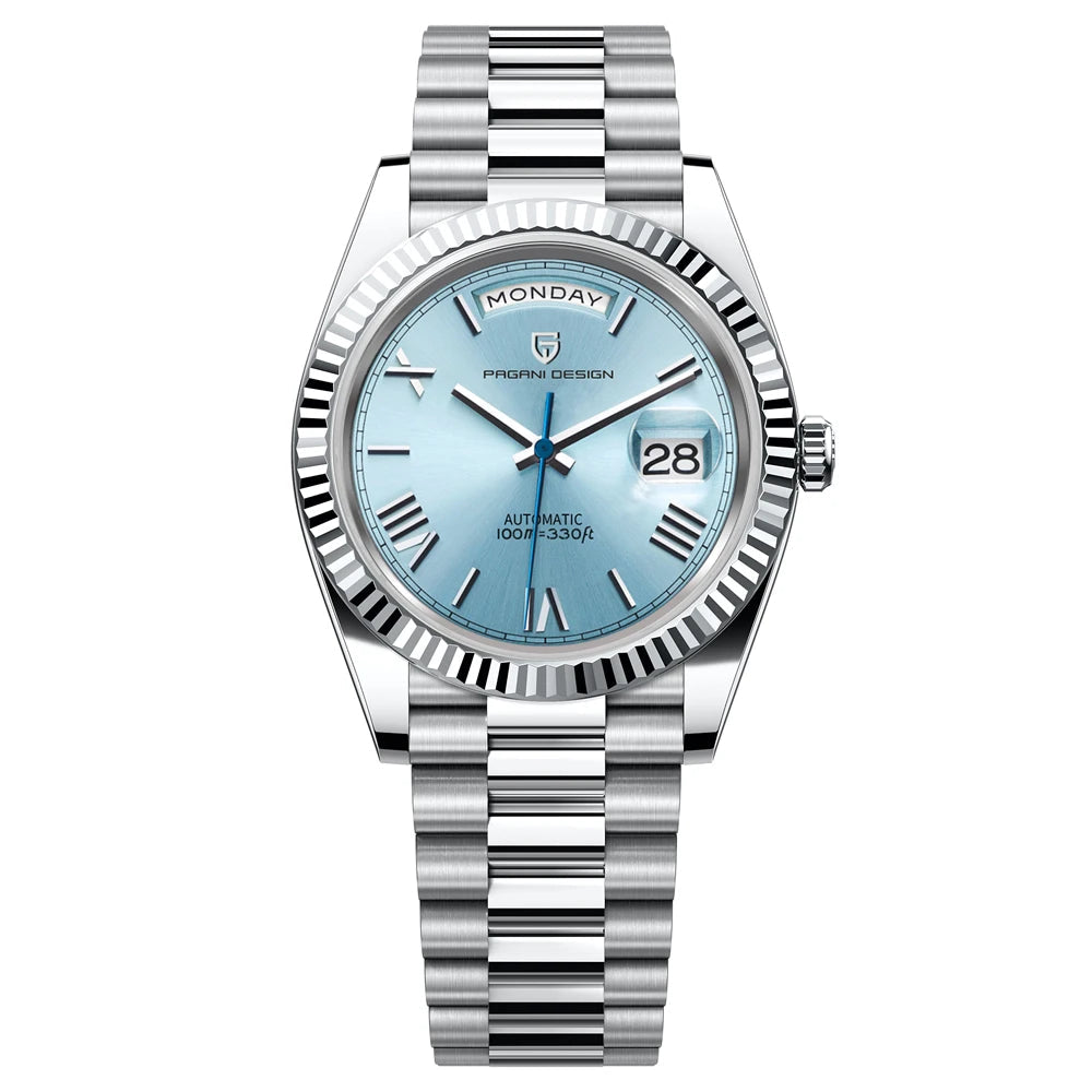 Discover the Pagani Silver Day Date with a Tiffany Blue Dial and Roman Numeral Markers.