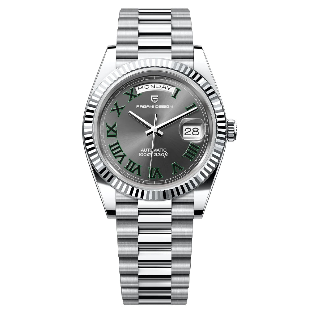 Discover the Wimbledon Day Date with a Grey Dial and Green Roman Numeral Markers.
